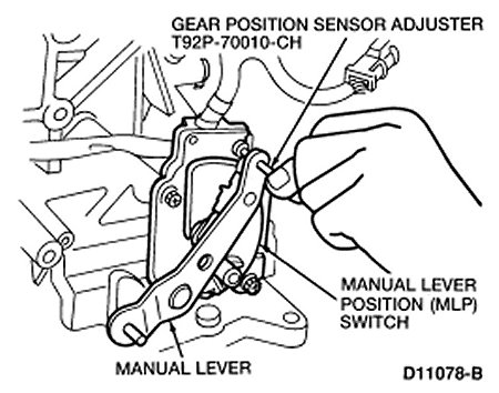 6. Insert Gear Position Sensor Adjuster T92P-70010-CH between the alignment holes in the MLP switch and the manual lever.