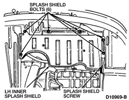 4. Remove the six splash shield bolts, splash shield screw and LH inner splash shield.