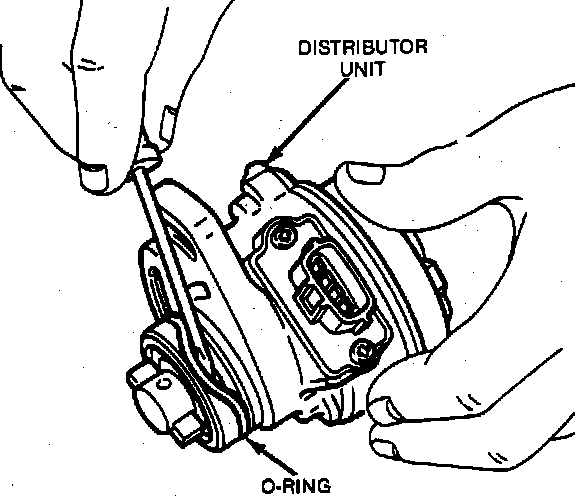 2. Position distributor and install mounting bolts. If distributor was not replaced, align reference marks made during removal and tighten the mounting bolts. If distributor was replaced, set timing before tightening bolts to 19-25 Nm (14-19 ft lb).