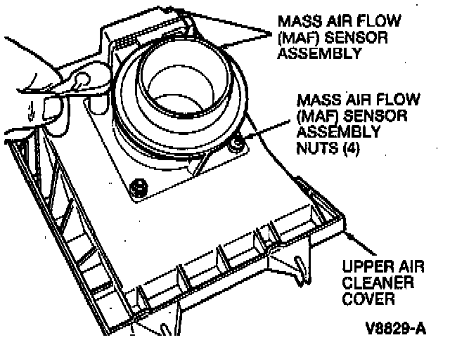4. Remove the Mass Air Flow (MAF) sensor assembly nuts, and remove the MAF sensor assembly from the upper air cleaner cover.