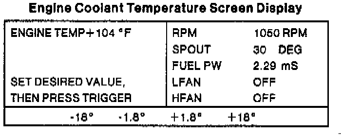 The ENGINE COOLANT TEMPERATURE level can be varied from -30°C to +110°C (-22°F to 230°F) by pressing any of the number keys, 4 through 7. Engine rpm, Spark Out (SPOUT), Fuel Pulse Width (FUEL PW), Low Fan Relay (LFAN), and High Fan Relay (HFAN) status are displayed. When this test is completed, press CANCEL to return to the ACTIVE COMMAND MODES menu (Screen Display J).