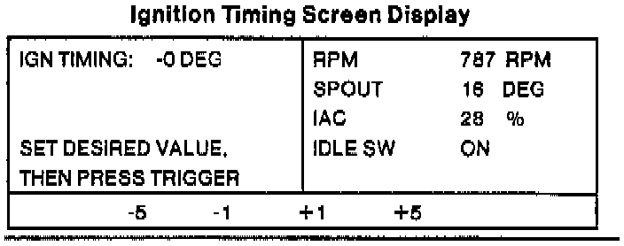 The IGNITION TIMING can be varied from 10 degrees (10 degrees BTDC) to O degrees by pressing any of the number keys, 4 through 7. Engine rpm, SPOUT degree, IAC valve opening, and IDLE SW are displayed. When this test is completed, press CANCEL to return to the ACTIVE COMMAND MODES menu (Screen Display J).