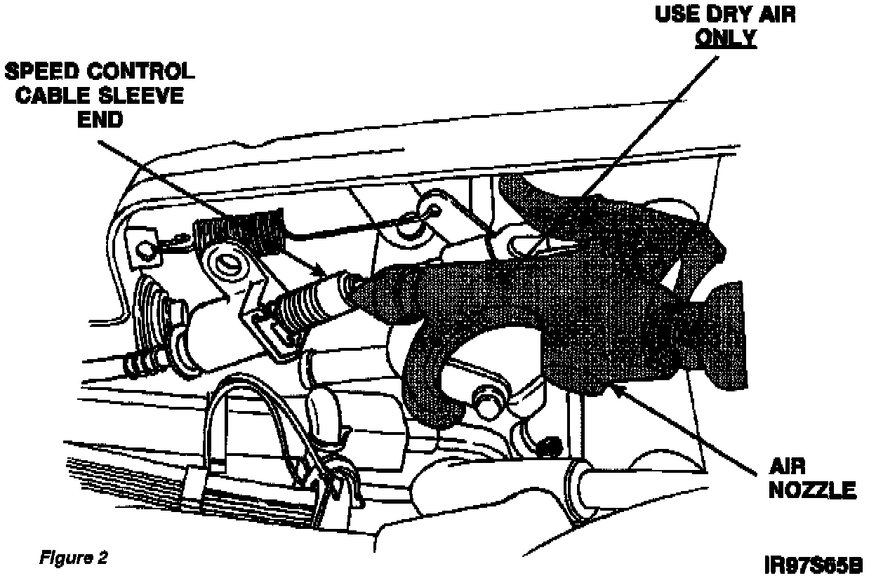 4. Using a standard air nozzle, "blow-out any accumulated water from the speed control cable by putting the nozzle against the sleeve end of the cable and applying pressurized air for 30 seconds. This will force any accumulated water back to the servo end where it will safely drain. See Figure 2.