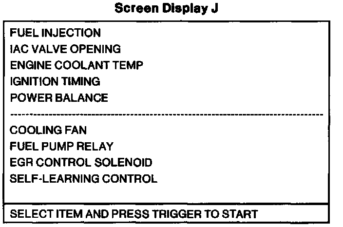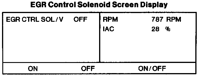 H. The EGR CONTROL SOLENOID can be set to ON, OFF, or ON 10FF (solenoid is repeatedly cycled on and off in three second intervals) by pressing the number key 3, 5, or 7. Engine rpm and IAC valve opening are displayed. When this test is completed, press CANCEL to return to the ACTIVE COMMAND MODES menu (Screen Display J).