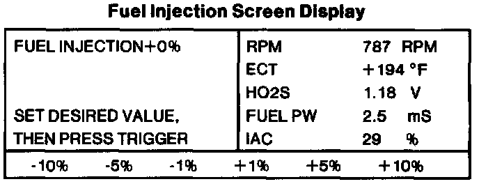 A. FUEL INJECTION is set at +0%. Use the number keys, 3 through 8, to set the desired fuel injection value. The setting range is -25% to +25%. Engine rpm, ECT sensor temperature, Heated Oxygen Sensor (HO2S) voltage, fuel pulse width (FUEL PW) and IAC valve opening are displayed. When this test is done, press CANCEL to return to the ACTIVE COMMAND MODES menu (Screen Display J).