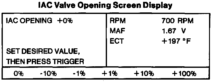 B. The IAC VALVE OPENING can be varied from 0% (closed) to 100% (wide open) by pressing number keys, 3 through 8, to set the desired value. Engine rpm, Mass Air Flow (MAF) sensor voltage, and Engine Coolant Temperature (ECT) sensor temperature are displayed. When this test is completed, press CANCEL to return to the ACTIVE COMMAND MODES menu (Screen Display J).