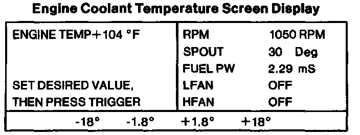 C. The ENGINE COOLANT TEMP level can be simulated from -30°C to + 1 10°C (-22°F to 230°F) by pressing any of the number keys, 4 through 7. Engine rpm, Spark Out (SPOUT), Fuel Pulse Width (FUEL PW), Low Fan Relay (LFAN) and High Fan Relay (HFAN) status are displayed. When this test is completed, press CANCEL to return to the ACTIVE COMMAND MODES menu (Screen Display J).