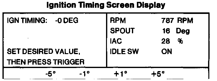 D. The IGNITION TIMING can be varied from -10 degree (10 degree BTDC) to 0 degree by pressing any of the number keys, 4 through 7. Engine rpm, SPOUT degree, IAC valve opening, and IDLE SW are displayed. When this test is completed, press CANCEL to return to the ACTIVE COMMAND MODES menu (Screen Display J).