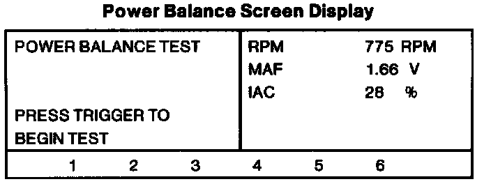 E. POWER BALANCE: Fuel injectors to any or all of the six cylinders can be initialized by pressing key number 3 for cylinder #1, key number 4 for cylinder #2,etc.