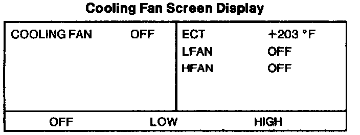 F. The COOLING FAN can be set to OFF, LOW, or HIGH by pressing the number key 3, 5, or 7. ECT sensor temperature, LFAN and HFAN status are displayed. When this test is completed, press CANCEL to return to the ACTIVE COMMAND MODES menu (Screen Display J).