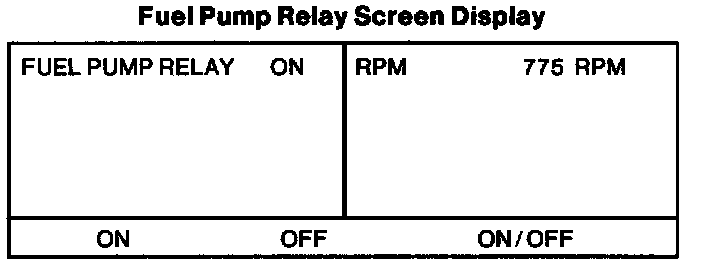 G. The FUEL PUMP RELAY can be set to ON, OFF, or ON/OFF (relay is repeatedly cycled on and off in three second intervals) by pressing the number key 3, 5, or 7. Engine rpm is displayed. When this test is completed, press CANCEL to return to the ACTIVE COMMAND MODES menu (Screen Display J).