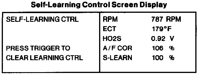 I. The SELF-LEARNING CONTROL learned data for the air/fuel ratio feedback compensation can be cleared by pressing TRIGGER. Engine rpm, ECT sensor temperature, HO2S voltage, and A/F COR (air/fuel correction ratio compensation) are displayed. When this test is completed, press CANCEL to return to the ACTIVE COMMAND MODES menu (Screen Display J).