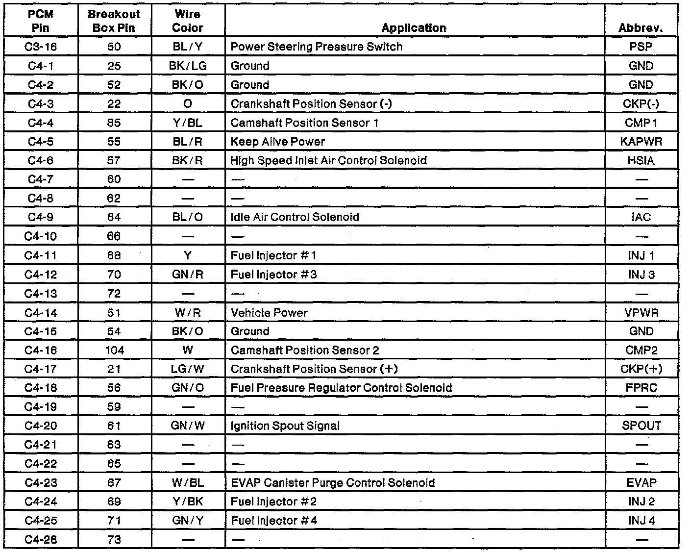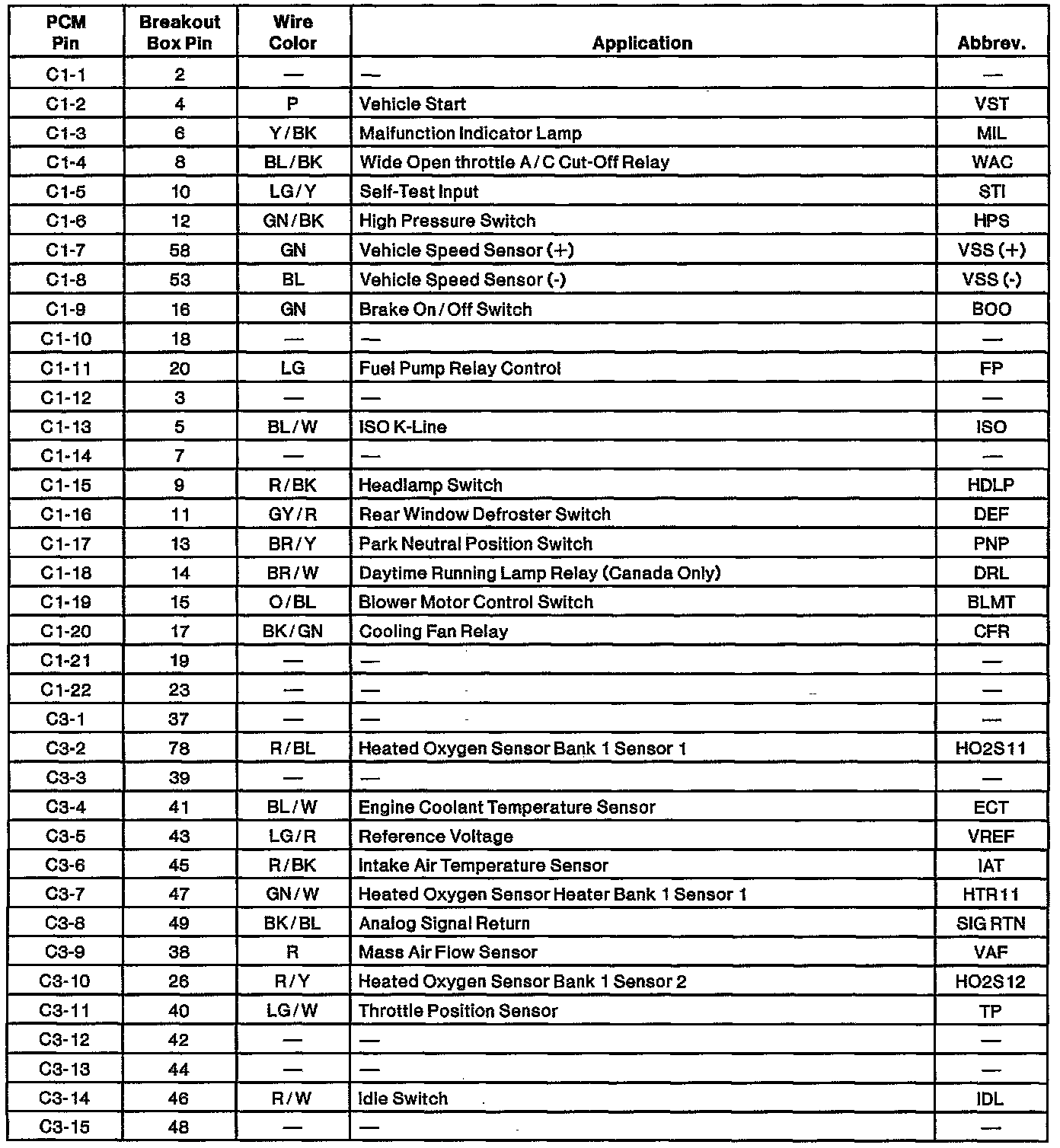 Powertrain Control Module (PCM) Connector Pin Usage: