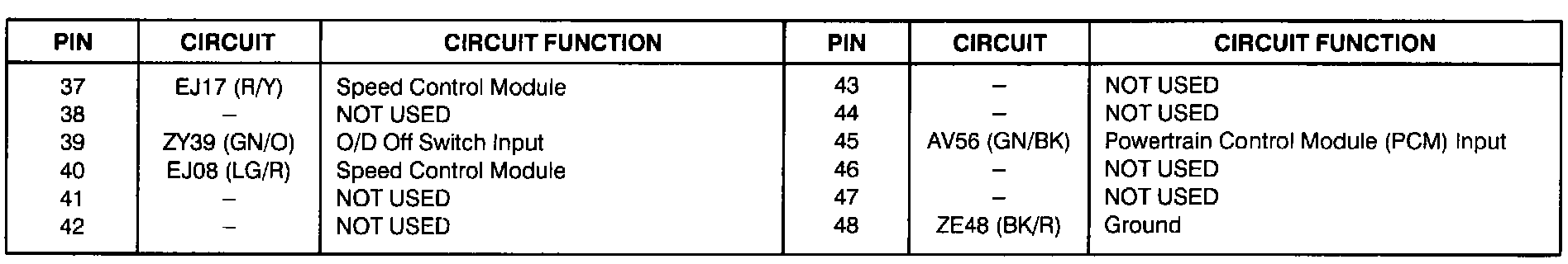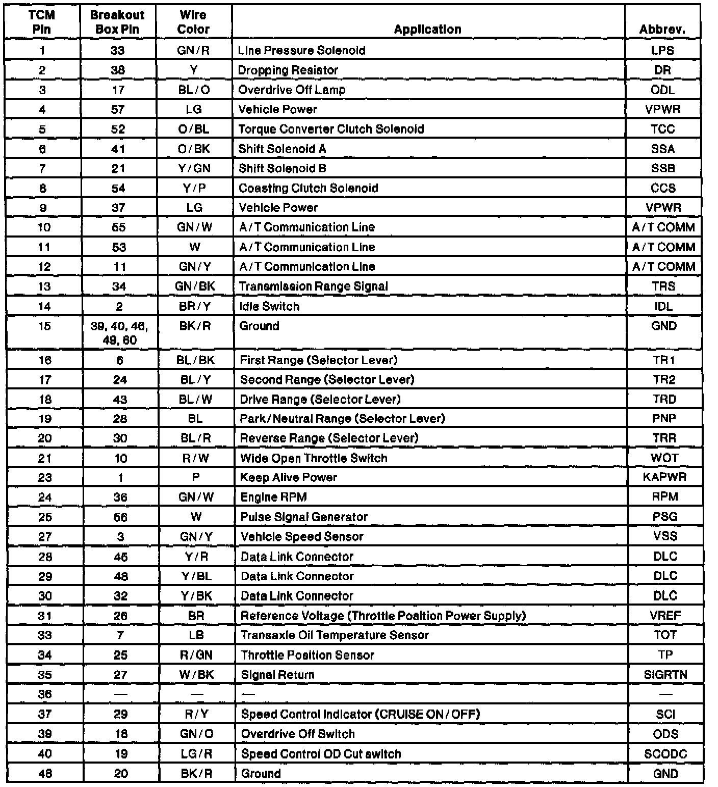 Transaxle Control Module (TCM) Connector Pin Usage: