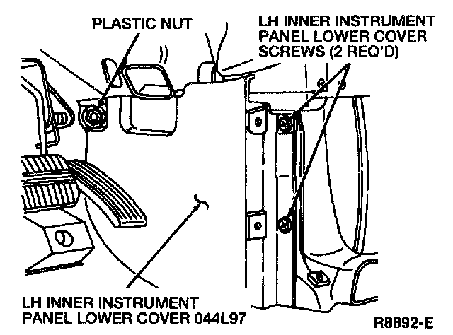 4. Remove the two RH inner instrument panel lower cover screws and the plastic nut. Then remove the RH inner instrument panel lower cover and disconnect the foot lamp electrical connector.