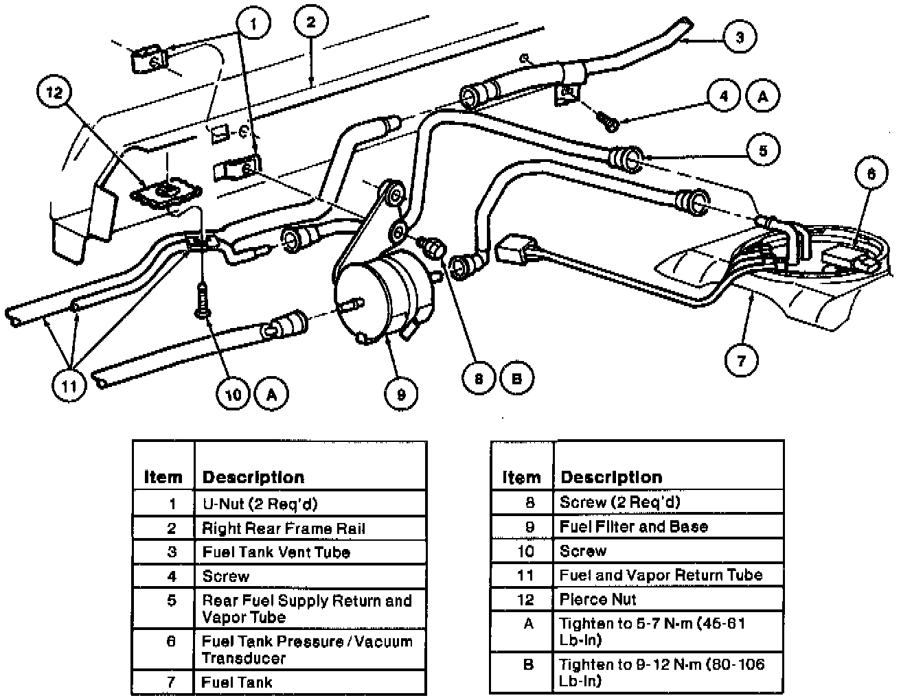 The fuel filter is located at the RH rear frame rail adjacent to the RH front corner of the fuel tank.