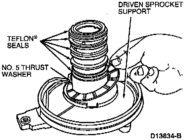 2. Install No. 5 thrust washer to driven sprocket support. Use petroleum jelly to hold washer in place. Install five new Teflon seal rings.