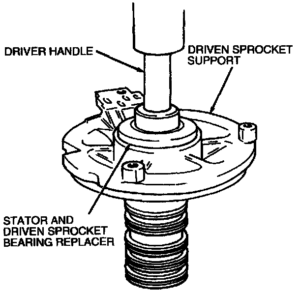 1. If removed, press driven sprocket bearing using an Arbor Press, Stator and Driven Sprocket Bearing Replacer T86P-70043-B, and Driver Handle T80T-4000-W.