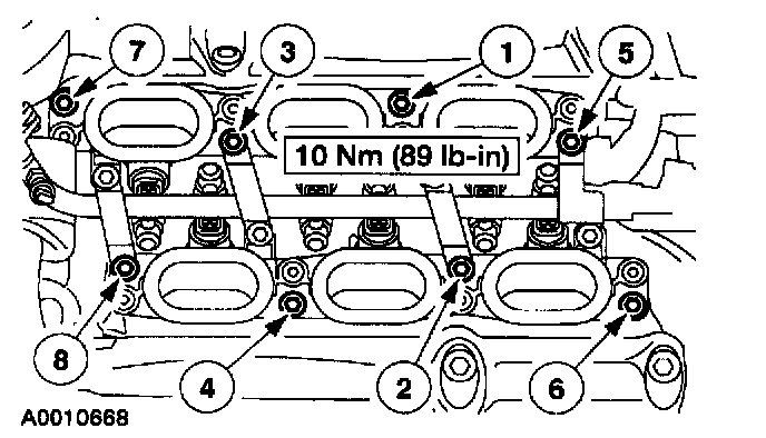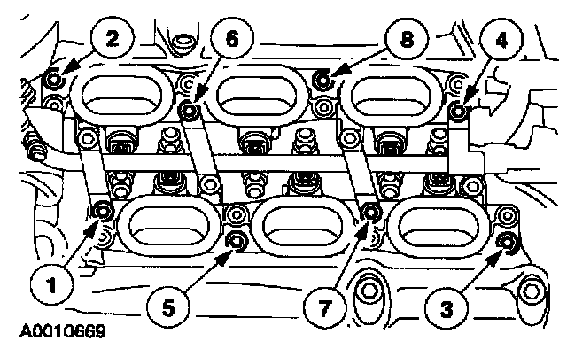 6. Remove the bolts in the sequence shown, and remove the lower intake manifold.