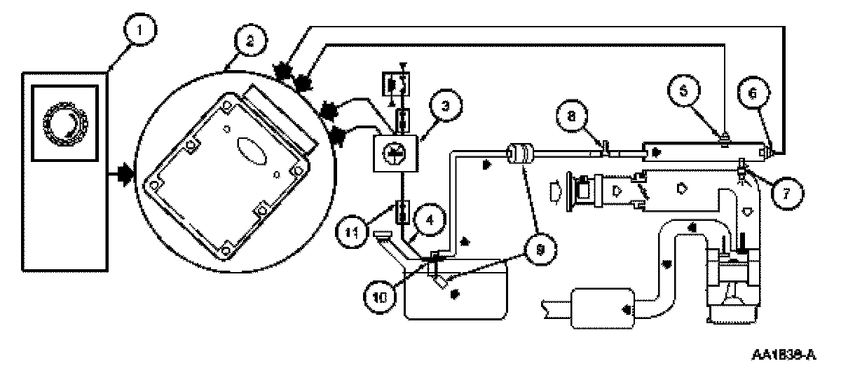 8. A pressure test point valve (schrader valve) is located on the fuel rail. This is used to measure fuel injector supply pressure for diagnostic procedures and repairs.