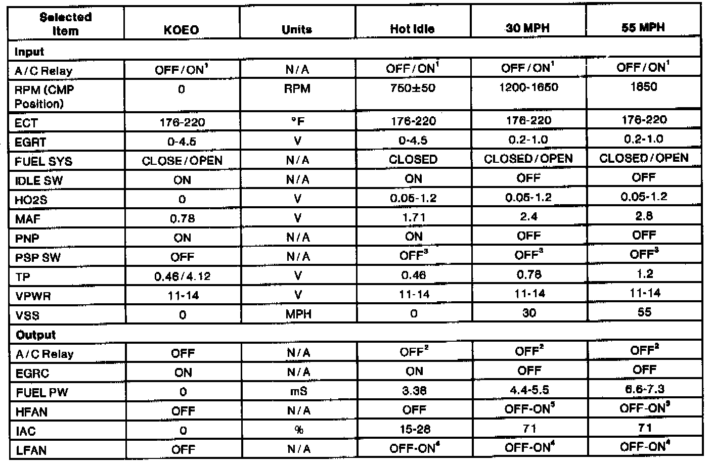 NOTE: For tests involving switches, the values will be switch OFF or ON.PCM INPUTS AND OUTPUTS