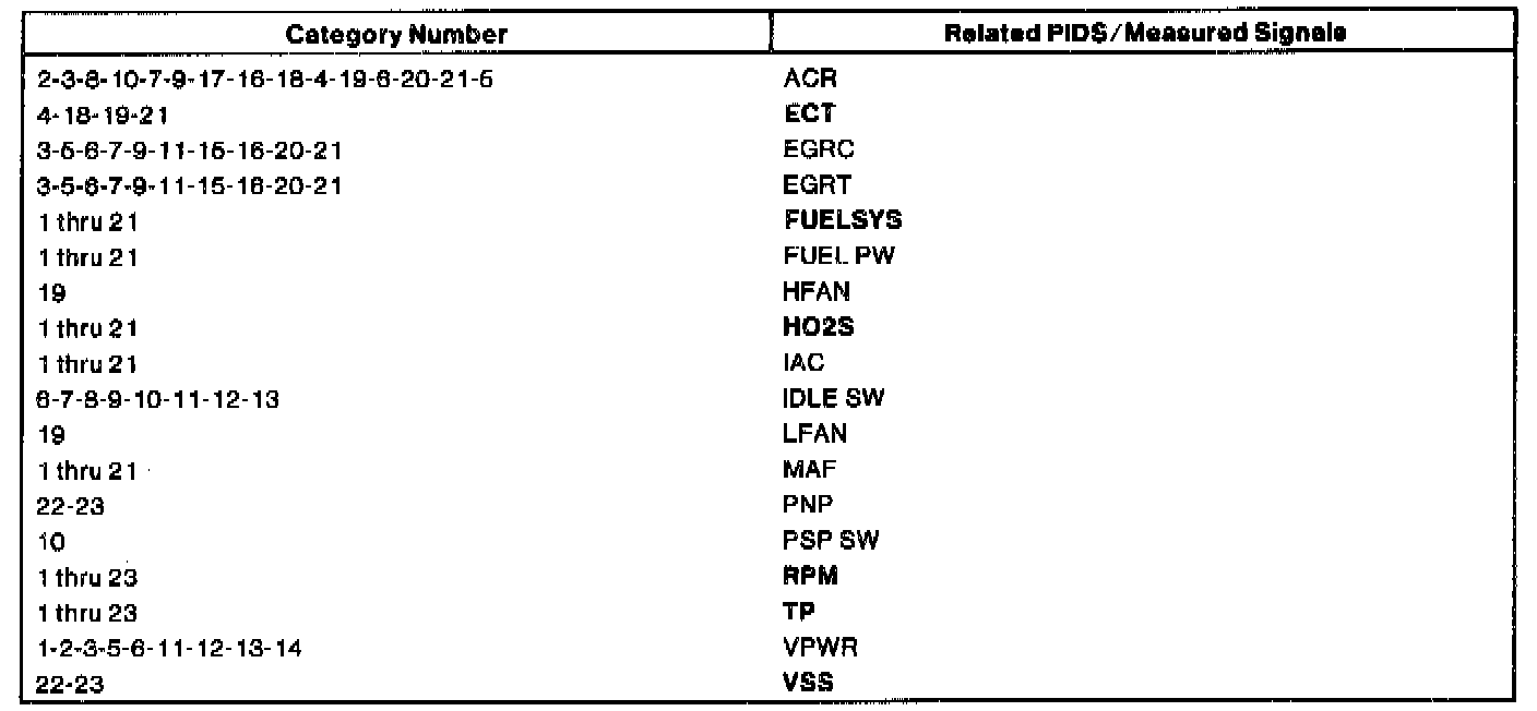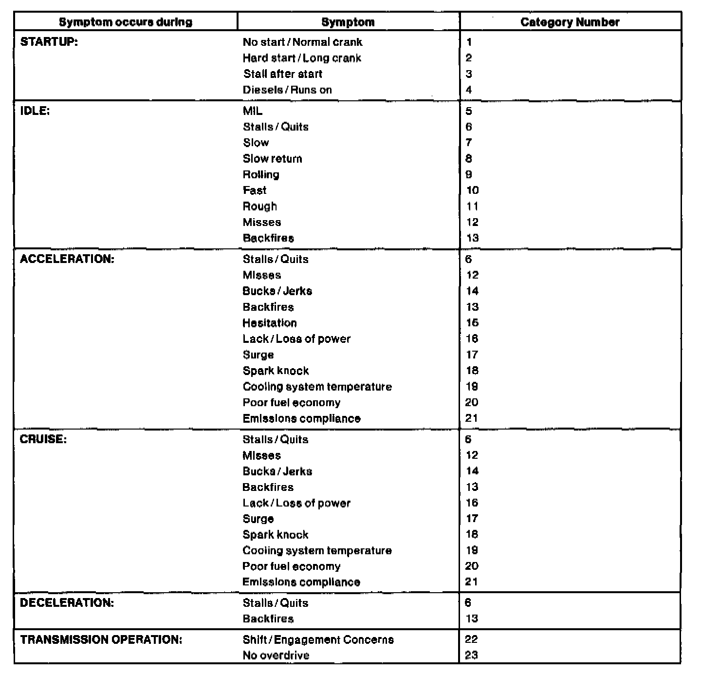 The Reference Value Symptom Chart is used to provide guidance in selecting the appropriate PID or measured signal related to the fault area. Select a symptom from the symptom chart along with the category number and proceed to the PID/Measured Signal Chart. For multiple symptoms, select the most evident.Symptom Chart: