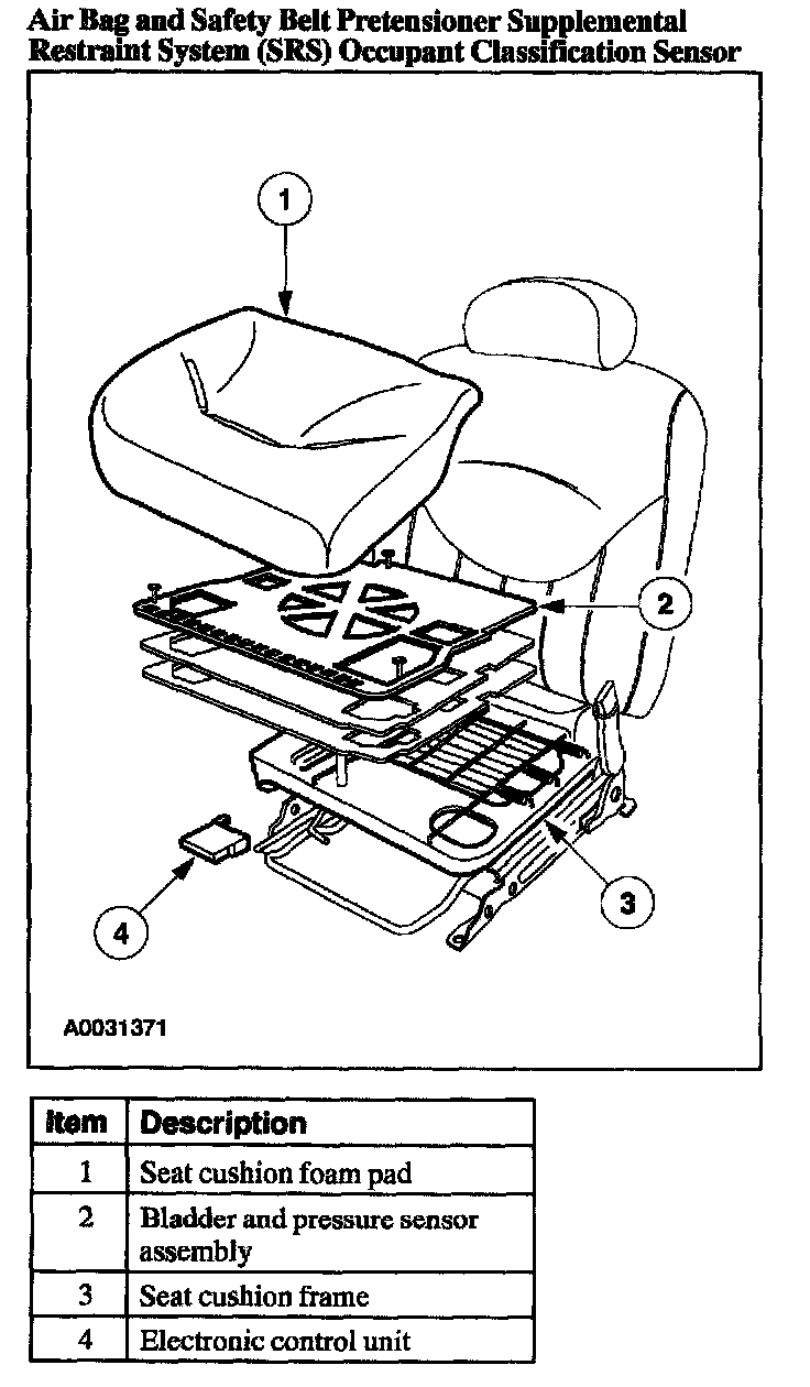 The front passenger seat Occupant Classification Sensor (OCS) is comprised of a silicone gel-filled bladder mounted in the seat cushion, a pressure sensor that is mounted to the seat frame, and an electronic control unit which is also mounted to the seat frame. Pressure is applied to the OCS bladder when weight of any occupant or object in the front passenger seat is present. The pressure is then transferred through a tube, is sensed by the OCS pressure sensor, then electronically communicated to the OCS electronic control unit. Based on programmed limits, the OCS electronic control unit will inform the restraints control module (RCM) via a High Speed Controller Area Network (CAN) if the passenger air bag module is to be deactivated. The RCM uses this information in determining if the passenger air bag module is to be deployed in the event of a deployable collision.