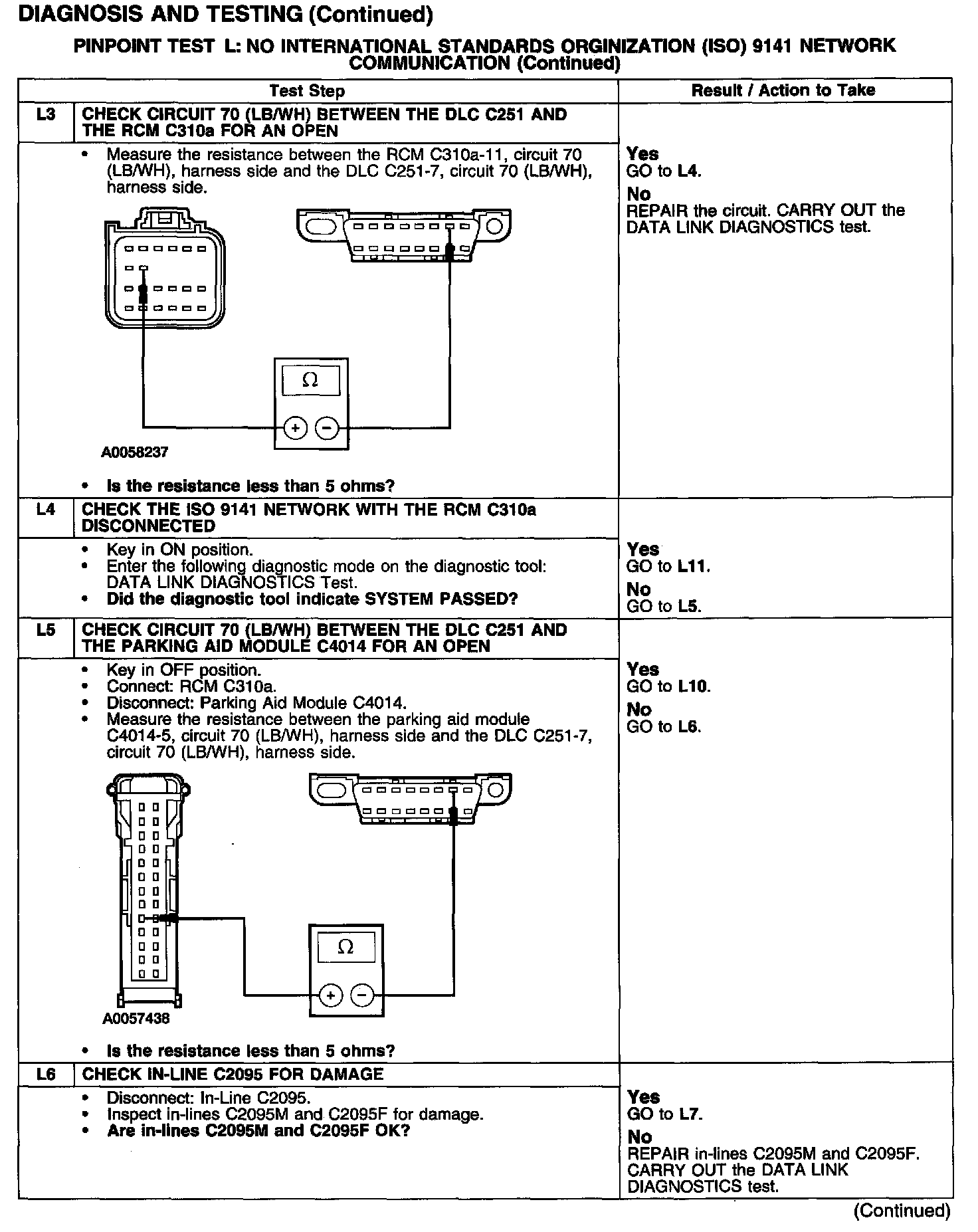 The reverse parking aid module and the restraint control module (RCM) communicate with the diagnostic tool through the ISO 9141 communications network circuit 70 (LB/WH). If circuit 70 (LB/WH) becomes open or shorted to ground, communications to that module will not be possible. Check circuit 70 (LB/WH) between the parking aid module, RCM and the DLC C251. Total resistance values must not be more than 5 ohms. If the resistance is more than 5 ohms there is an open in circuit 70 (LB/WH), damage to the DLC C251, damage to the parking aid module, RCM, or a problem in one of the in-line connectors C2095 or C408. If, after individual checks of each circuit leading to a module show resistance values less than 5 ohms and no in-line connector issues present, the data link diagnostics test must be run with the module in question disconnected. If the data links diagnostics test passes with the module in question disconnected it is the source of the concern and should be removed and a new module installed.