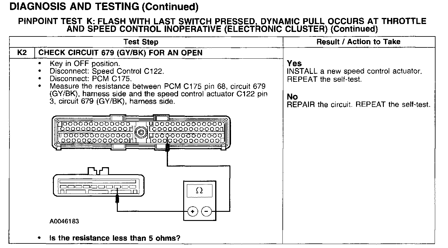 PINPOINT TEST K: FLASH WITH LAST SWITCH PRESSED, DYNAMIC PULL OCCURS AT THROTTLE AND SPEED CONTROL INOPERATIVE (ELECTRONIC CLUSTER)