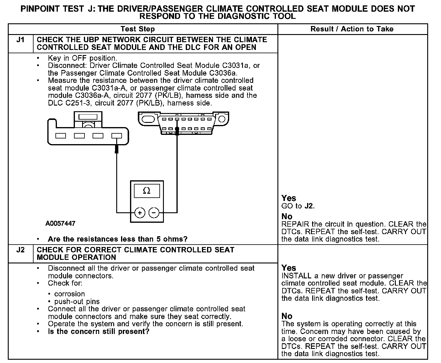 PINPOINT TEST J: THE DRIVER/PASSENGER CLIMATE CONTROLLED SEAT MODULE DOES NOT RESPOND TO THE DIAGNOSTIC TOOLTest J1-J2: