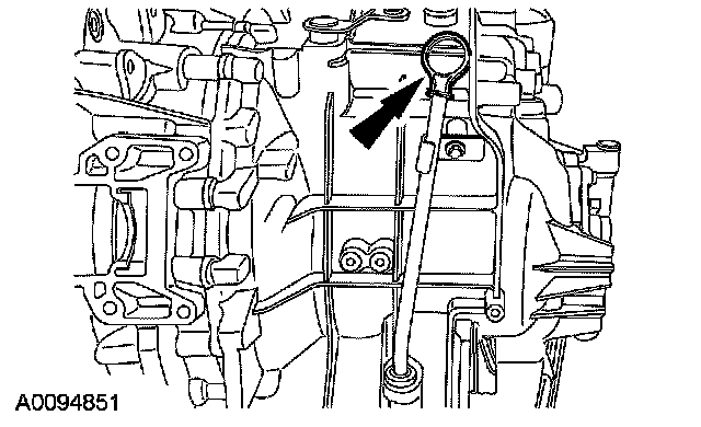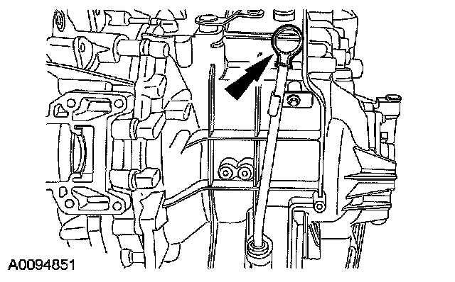7. Remove the fluid level indicator and check for correct fluid level. The fluid level should be at the bottom of the top level indicator hole with the CVT automatic transmission fluid temperature in the 43°C - 47°C (109°F - 117°F) range.