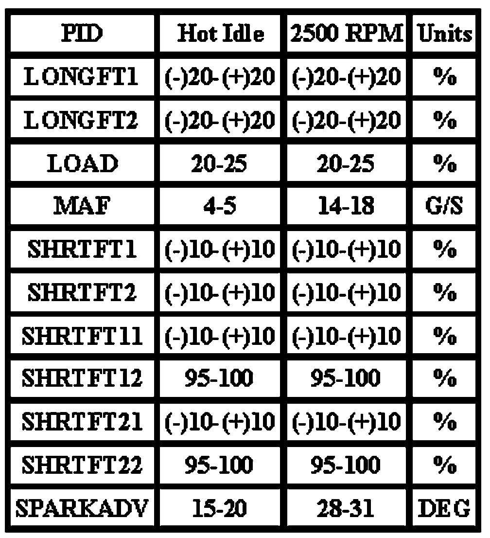 Note: All generic OBD readings under no load (PARK or NEUTRAL).