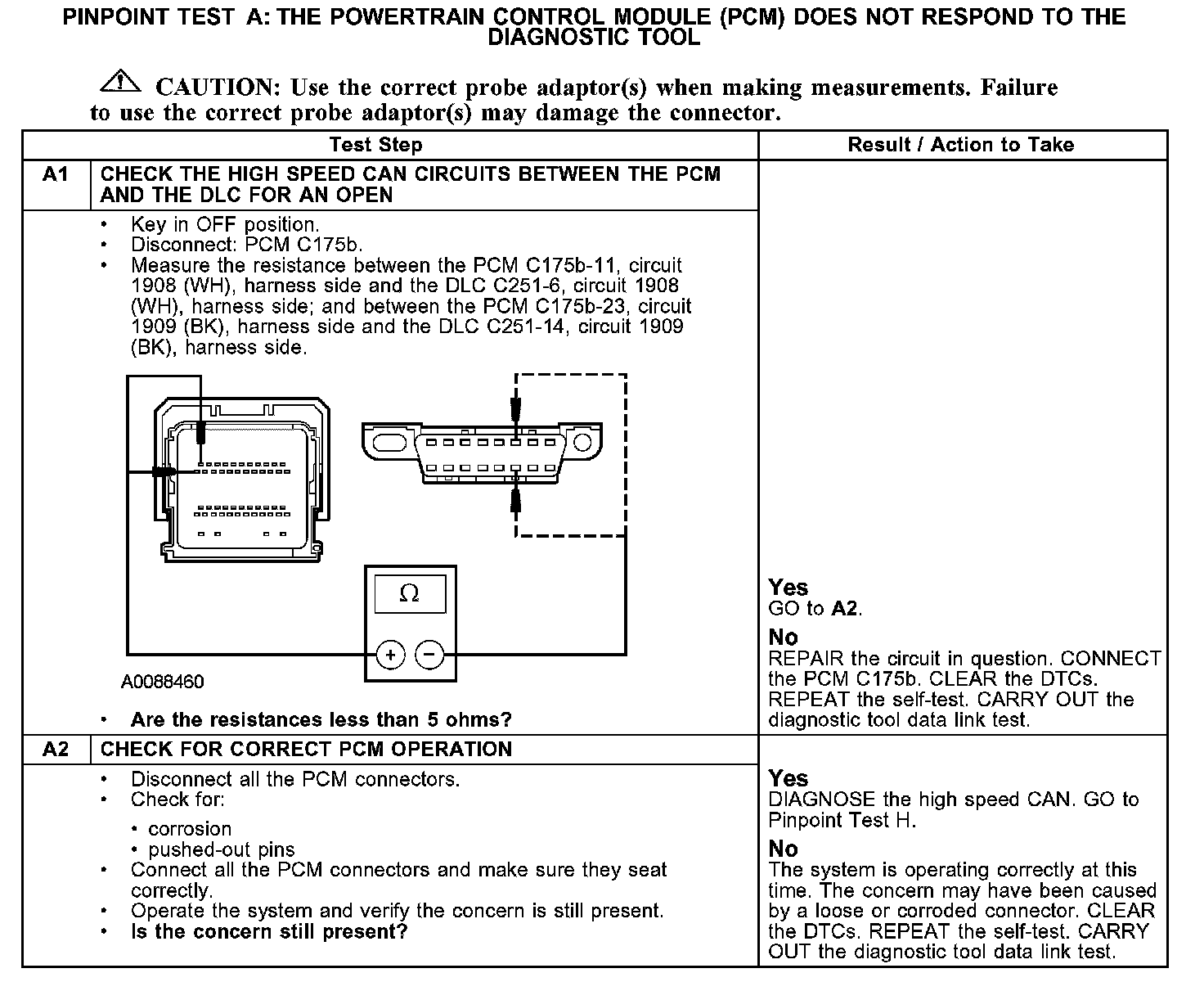 PINPOINT TEST A: THE POWERTRAIN CONTROL MODULE (PCM) DOES NOT RESPOND TO THE DIAGNOSTIC TOOLA1-A2: