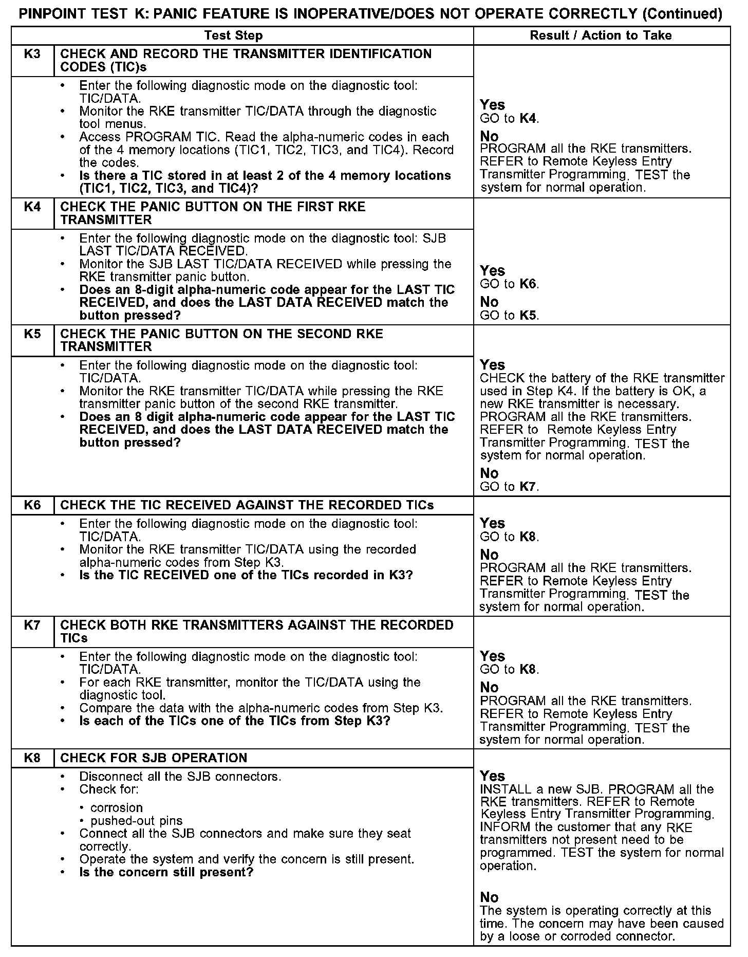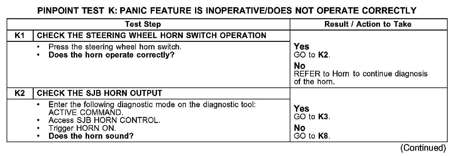 PINPOINT TEST K: PANIC FEATURE IS INOPERATIVE/DOES NOT OPERATE CORRECTLYK1-K2: