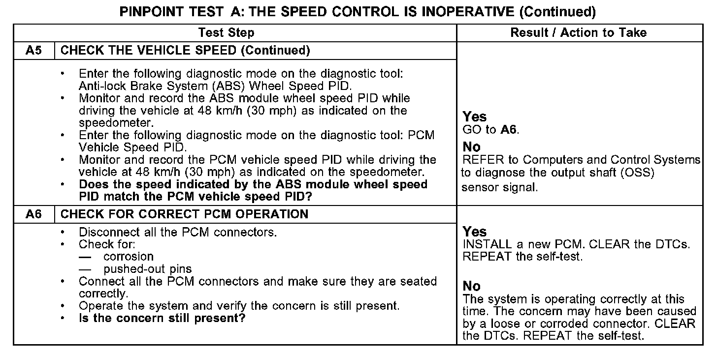 PINPOINT TEST A: THE SPEED CONTROL IS INOPERATIVEA1-A5: