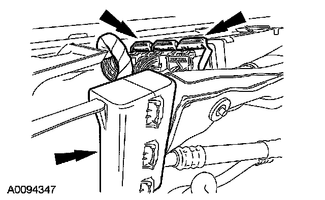 16. Disconnect the 2 powertrain control module (PCM) electrical connectors and detach the wiring conduit.