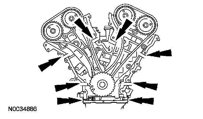CAUTION: During engine repair procedures, cleanliness is extremely important. Any foreign material, including any material created while cleaning gasket surfaces, that enters the oil passages, coolant passages or the oil pan, can cause engine failure.