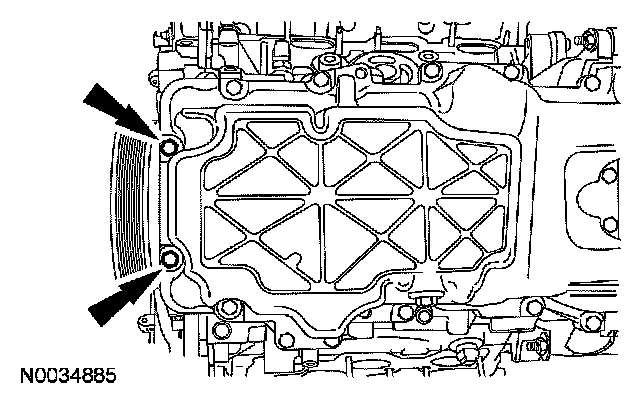 15. Remove the 2 oil pan-to-front cover bolts.