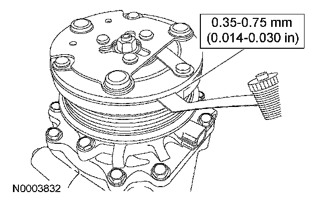 11. Measure and adjust the clutch air gap by removing or adding A/C clutch disc and hub spacers.