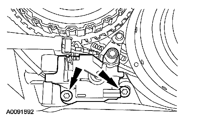 32. Make sure when routing the range selector valve assembly wiring harness that it is between the bolt holes and is pressed into the case retainers.