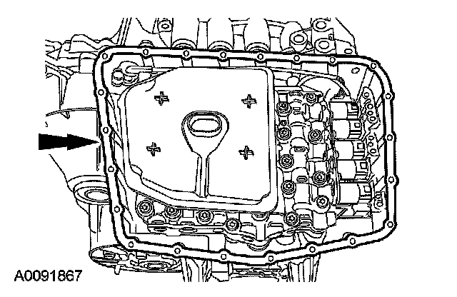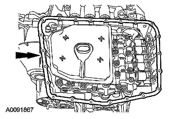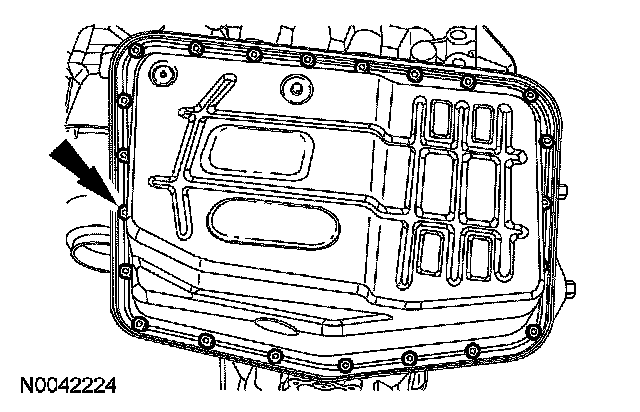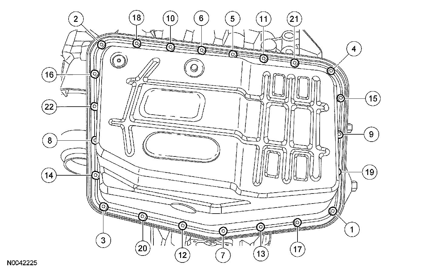 6. Install the fluid pan and the bolts. Tighten in the sequence shown.