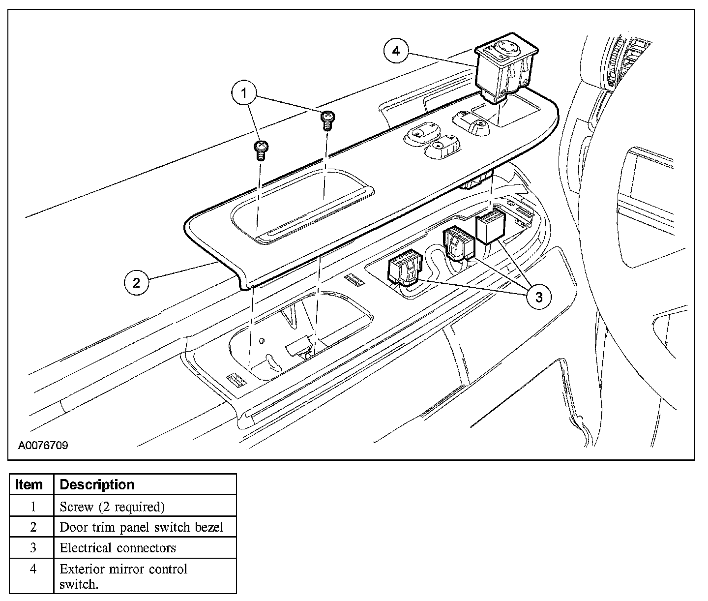 2. Lift the door trim panel switch bezel to expose the electrical connectors and disconnect the exterior rear view mirror electrical connector.