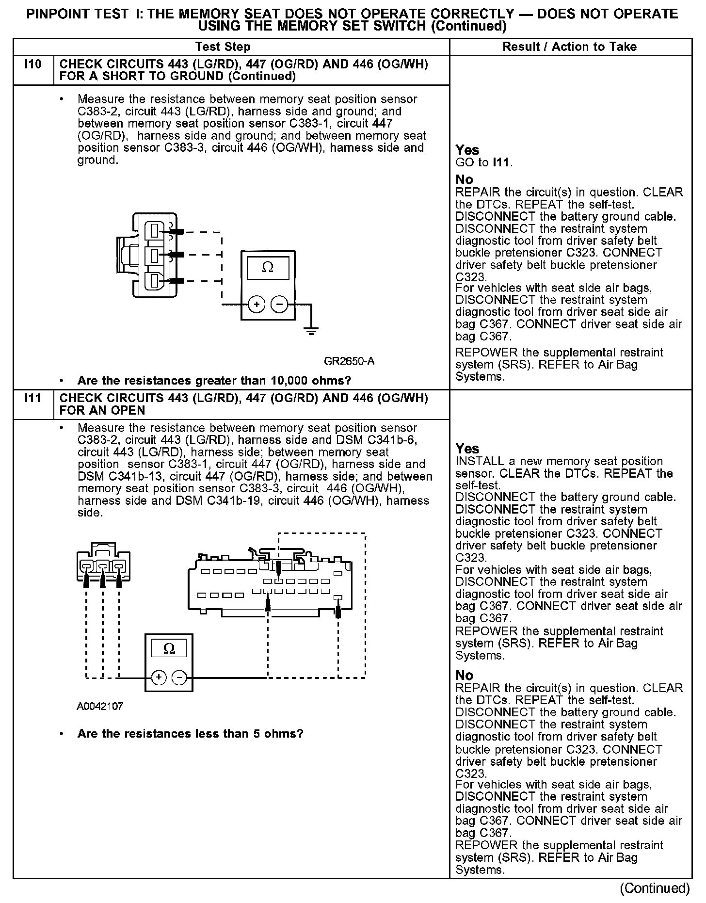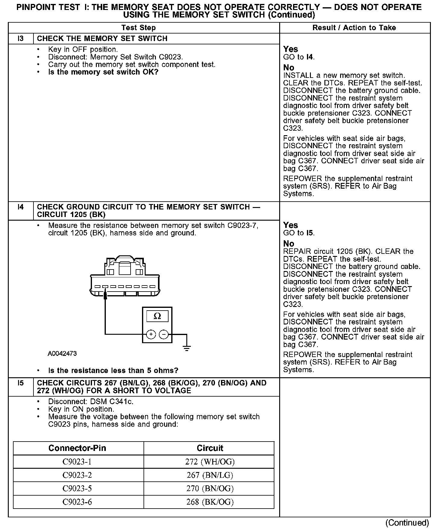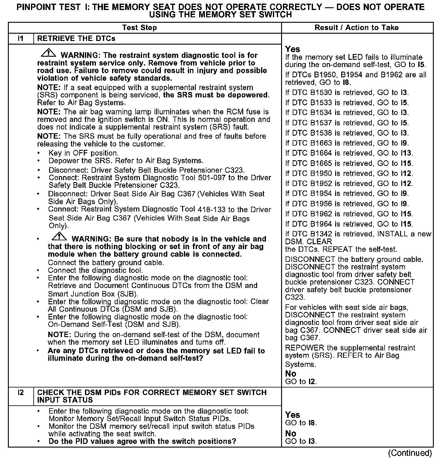 PINPOINT TEST I: THE MEMORY SEAT DOES NOT OPERATE CORRECTLY - DOES NOT OPERATE USING THE MEMORY SET SWITCHI1-I2: