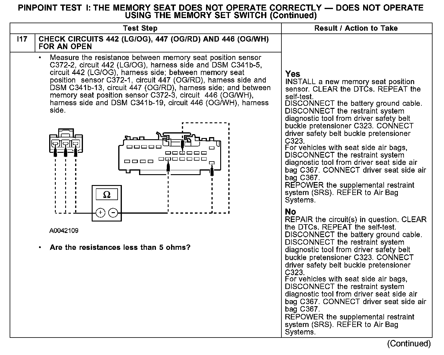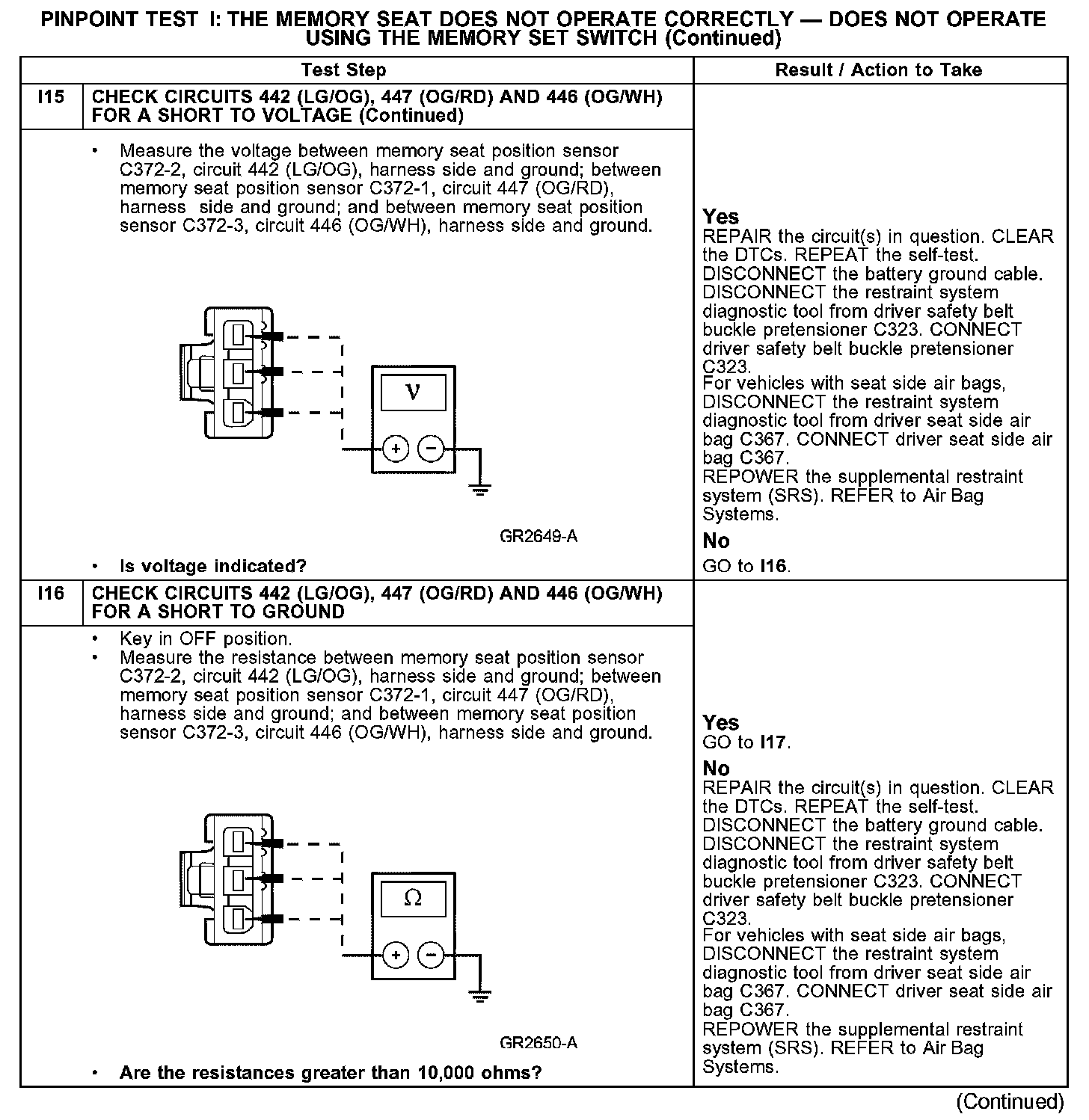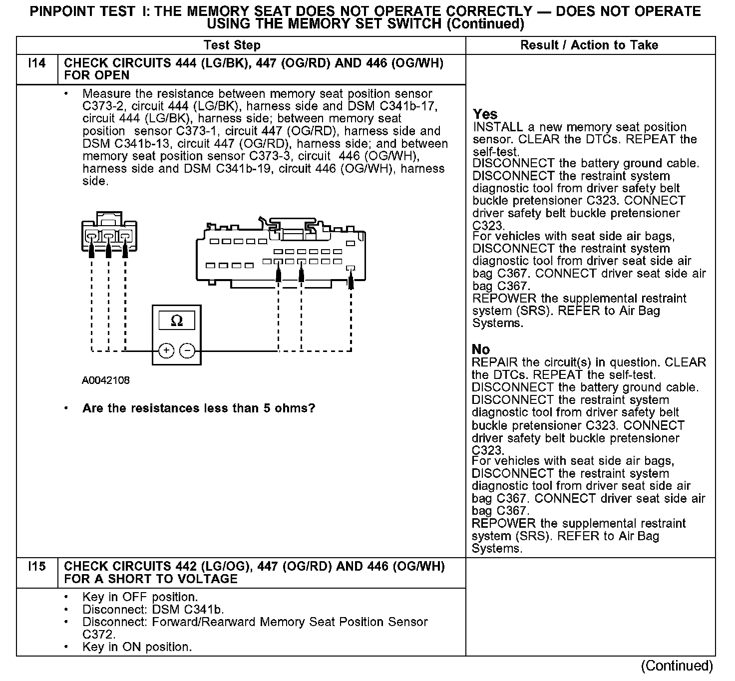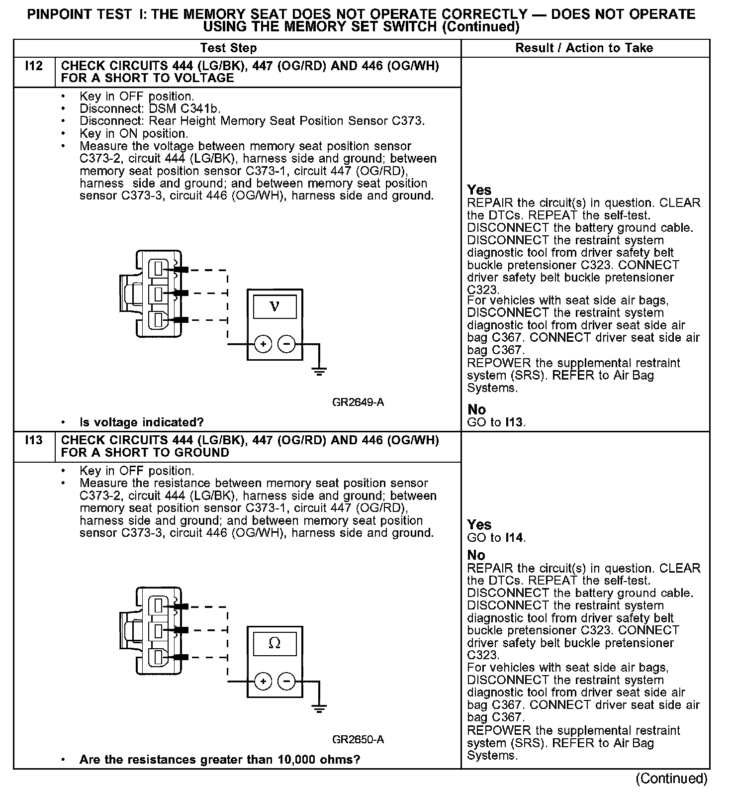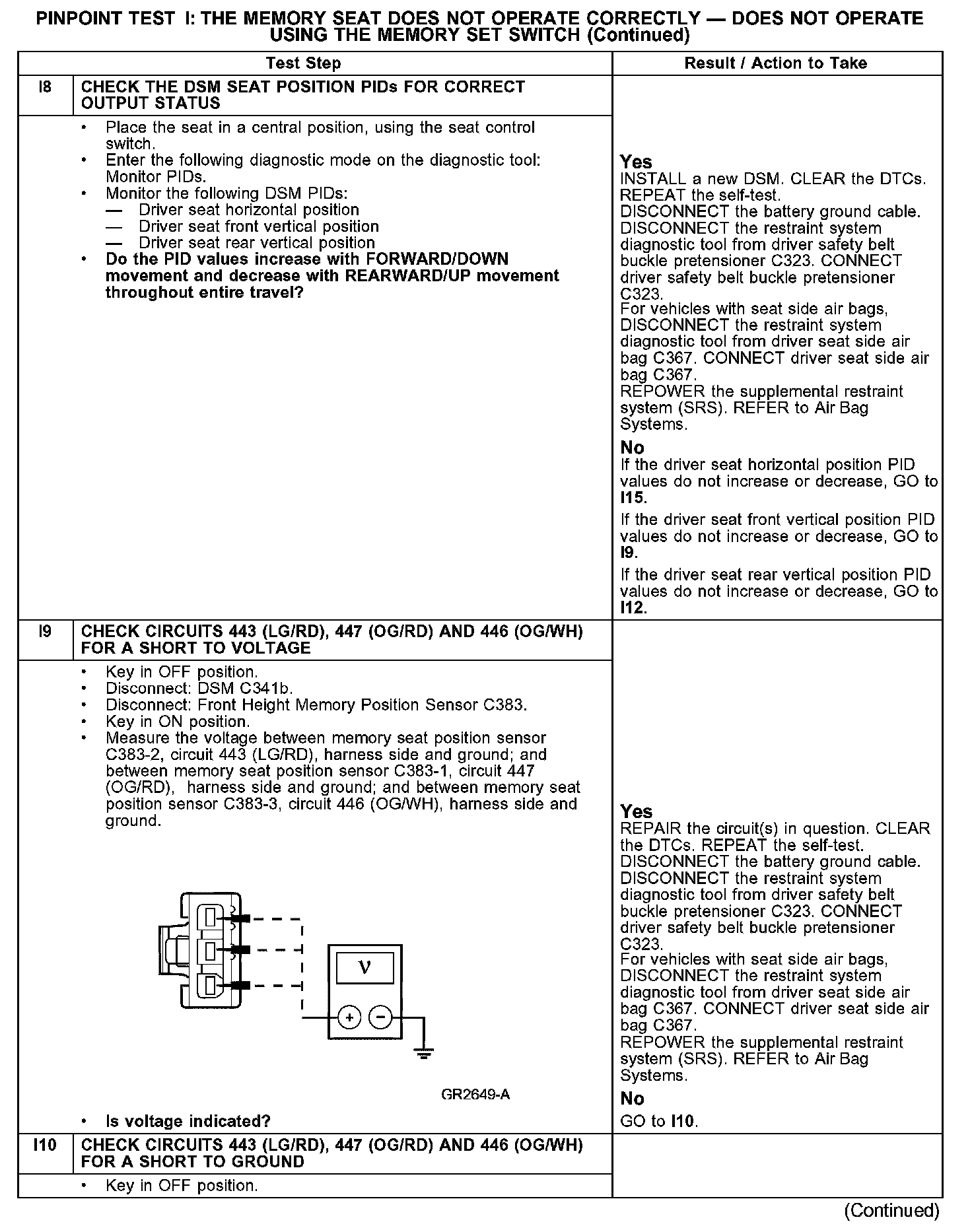 The pinpoint test diagnoses a memory seat that does not operate correctly using the memory set switch. If the memory seat does not move in all directions using the seat control switch, GO to Pinpoint Test H. Test H: The Memory Seat Is Inoperative