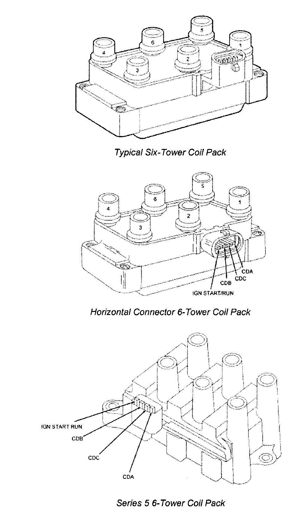 Coil packs come in 6-tower, 6-tower horizontal and series 5 6-tower models (Freestar/Monterey/F 150 Heritage 3.9/4.2L). Two adjacent coil towers share a common coil and are called a matched pair. For 6-tower coil pack (6 cylinder) applications, the matched pairs are 1 and 5, 2 and 6, and 3 and 4.