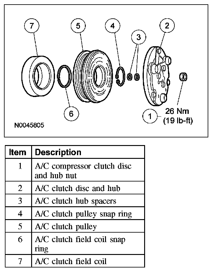 NOTE: The A/C clutch components should be reused unless obvious signs of damage are found. If excessive grooving is found, a new A/C clutch disc and hub and a new A/C compressor pulley must be installed together. Otherwise, each component can be installed individually where needed.