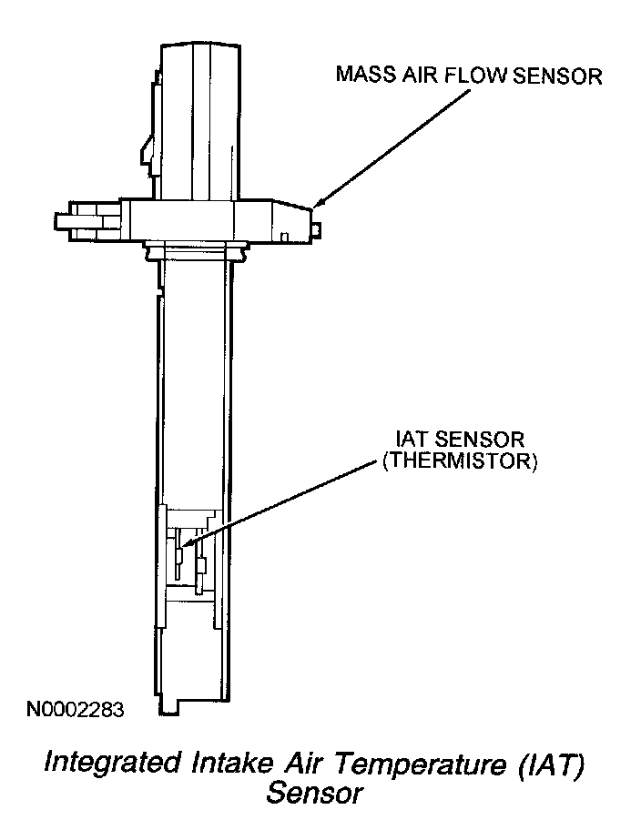 The IAT sensor is integrated into the mass air flow (MAF) sensor. It is a thermistor device in which resistance changes with temperature. The electrical resistance of a thermistor decreases as the temperature increases, and the resistance increases as the temperature decreases. The varying resistance affects the voltage drop across the sensor terminals and provides electrical signals to the PCM corresponding to temperature.