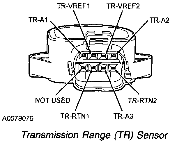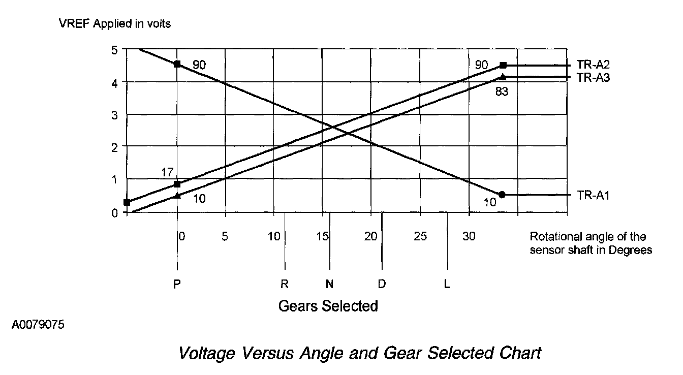 The TR-A1 signal has a negative voltage slope, meaning the voltage decreases when the sensor angle increases. The typical TR voltage ranges from approximately 4.5 volts in the PARK position to approximately 1 volt in the LOW gear position. The TR-A2 and the TR-A3 signals both have a positive voltage slope. Voltages increase as the sensor angle increases. The typical voltage for the TR-A2 and the TR-A3 range from about 0.6 volts in the PARK position to about 3.5 volts in the LOW gear position.