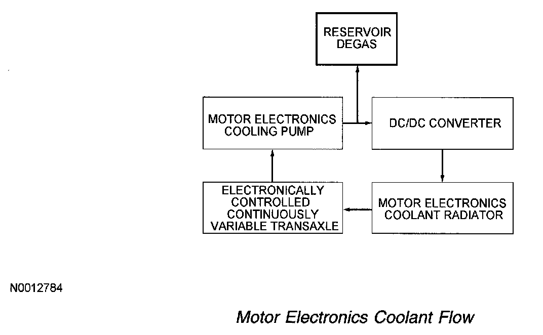 The motor electronics cooling system is required to maintain an acceptable temperature for the transaxle and the DC/DC converter. The system temperature is monitored by the motor electronics coolant temperature (MECT) sensor, which is an input to the PCM. The PCM commands the MECP using the MECP relay. The MECP is commanded on whenever the traction battery contactors are closed. The coolant in the system flows in a loop from the MECP, to the DC/DC converter, to the top hose port of the motor electronics radiator, out of the motor electronics radiator bottom hose port, into the transaxle, and back into the MECP. The cooling system has a degassing system built into the loop that bleeds air/gases into the coolant reservoir.