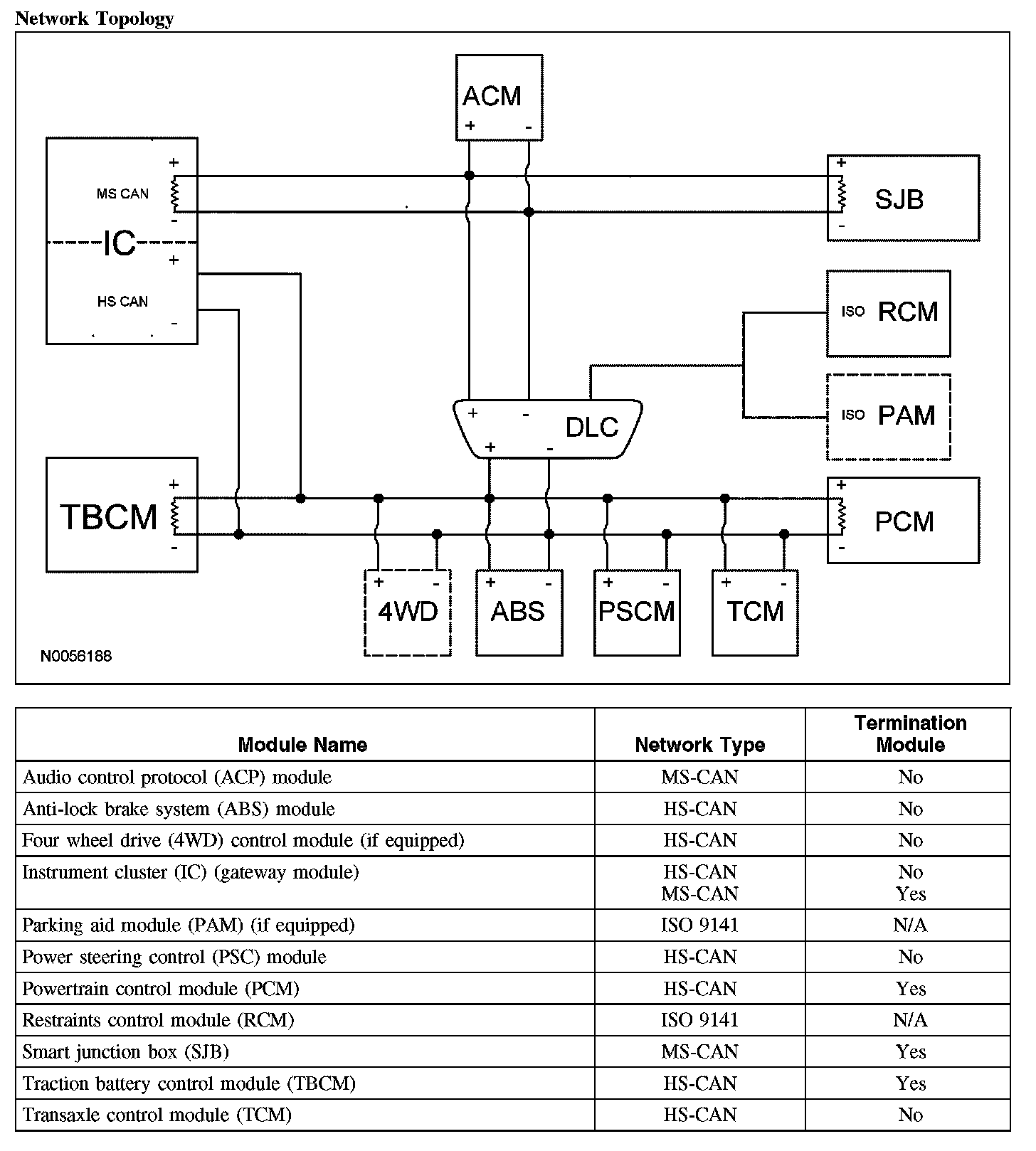 The instrument cluster is the gateway module, translating HS-CAN to MS-CAN and vice versa. This information allows a message to be distributed throughout both networks. The instrument cluster is the only module on this vehicle that has this ability.